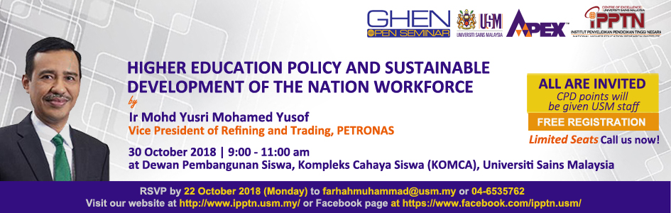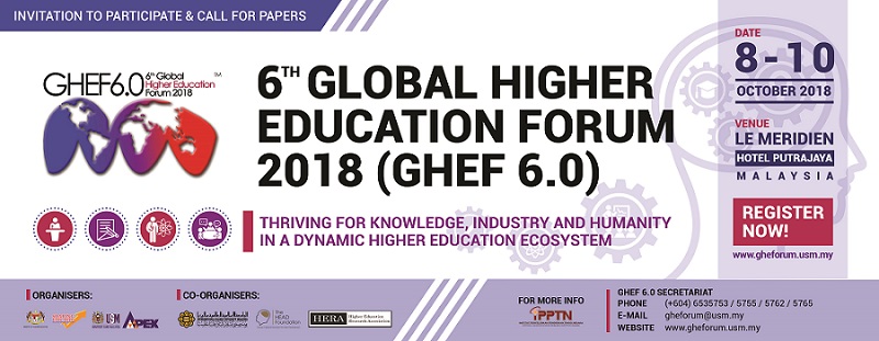 GHEN OPEN SEMINAR SERIES 2018 : HIGHER EDUCATION POLICY AND SUSTAINABLE DEVELOPMENT OF THE NATIONA WORKFORCE | 30 OCTOBER 2018 Global Higher Education Forum 2018 (GHEF6.0) | 8-10 October 2018.